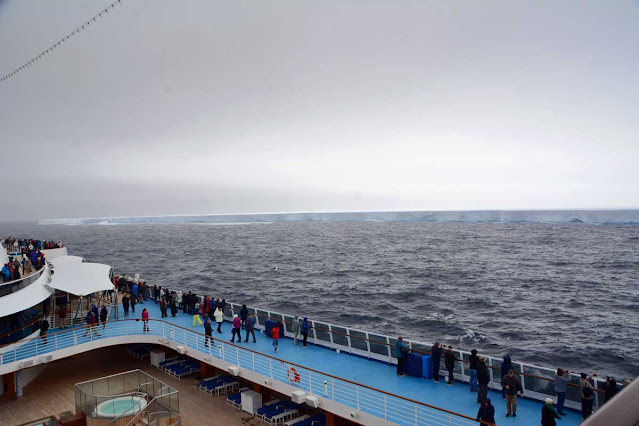 It's impossible to show the size of this huge berg, but here's my best attempt. Shot from the highest deck you can barely see the top of the iceberg. The ship is about a half mile from the berg.
